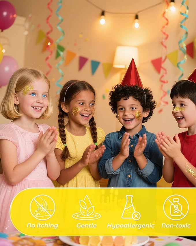 - VEGAN, SAFE & GENTLE: Hypoallergenic, and cruelty-free ingredients, our Gold Face Glitter Gel is safe for all ages—even kids! It glides on comfortably without irritating skin and washes off easily with soap and water. Party with peace of mind