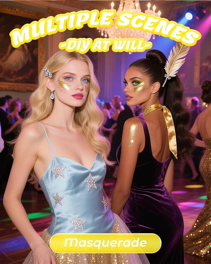 - EASY APPLICATION, NO MESS: No glue needed! This self-adhesive Gold Body Glitter gel applies smoothly with fingertips or a brush—so you can create stunning looks in seconds. Ideal for last-minute glitter transformations on your face, body, hair, or nails. Layer it for intense dimension or wear it lightly for a subtle gleam
