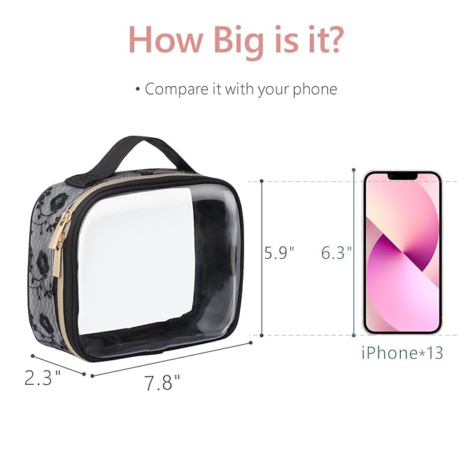 - TSA Approved, Meet Liquids Rule: The medium size clear makeup bag is 7.8 x 2.3 x 5.9 inch, it follows the TSA's 3-1-1 Liquid Rule published by TSA. You can quickly pass the airport security screening. High-quality metal zipper is smooth not get stuck