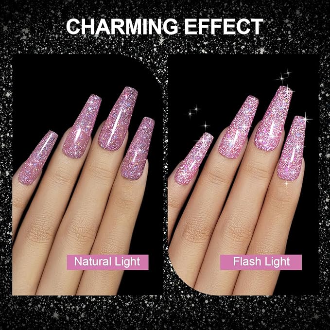 - Good Choice: You will get a bottle of 7.5 ml reflective glitter gel nail polish. It is very shiny because of full of rainbow sequin and diamond glitter powder. It is also a good choice for yourself or your friends during birthdays, holidays, anniversaries, or any special occasions. You will get fantastic and super shiny nails if you apply this gel polish. It's great for home use and nail salons