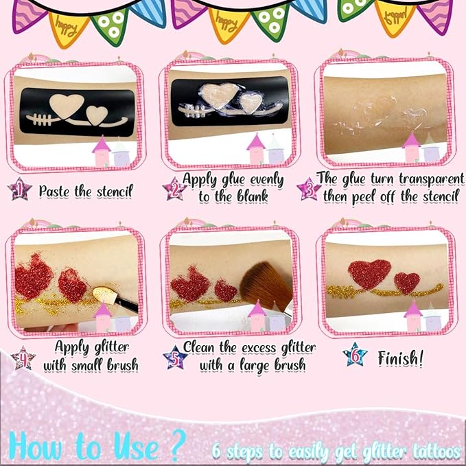 - Simple Use & Removal: Stick the stencil to the area you want to tattoo and brush on the glue. When the glue becomes slightly transparent, immediately peel off the stencil and apply glitter with a small brush. After that, press the pattern with a large brush and sweep off the excess glitter. You can use soapy water or baby wipes with gentle scrubbing to easily remove it.