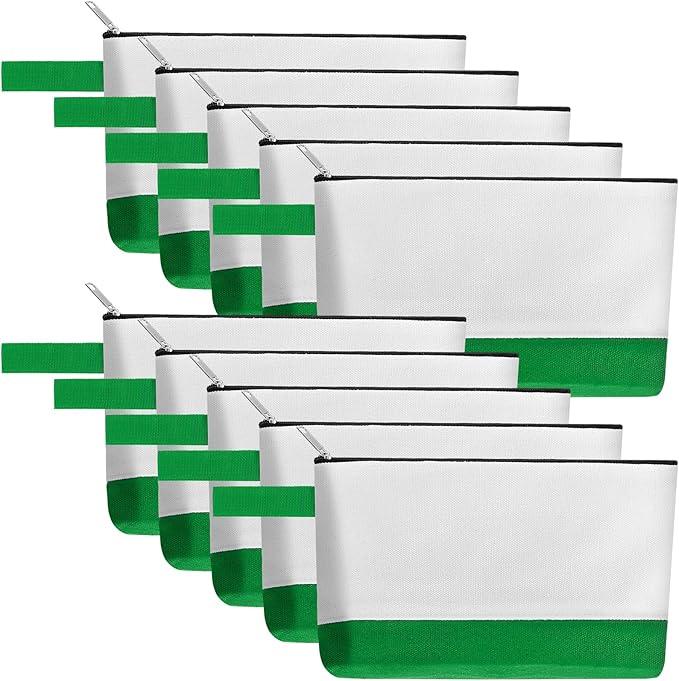 10 Pieces Cotton Canvas Makeup Bag with Bottom and Strap, Multi-Purpose Cosmetic Bag with Zipper Travel Toiletry Pouch, Blank DIY Craft Bag (White&Green, M)