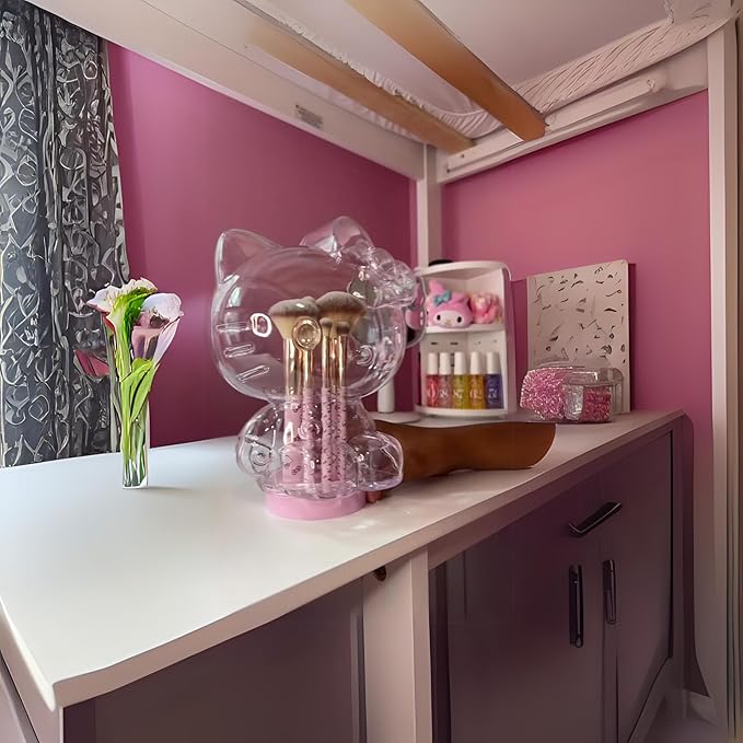 - HELLO KITTY CLOCHE: This Hello Kitty shaped transparent 3D cloche for the stand not only safeguards your makeup brushes from dust but also adds a touch of elegance to your makeup room decor