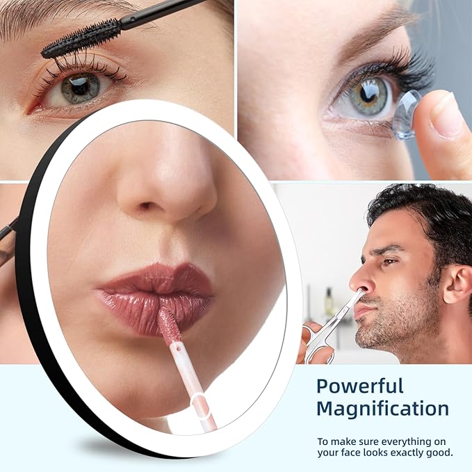 - 【WIDE APPLICATION】 The 30x magnifying mirror with light is very powerful. The pores of the face are clearly visible, making it ideal for focusing on specific parts of your face or eyes in great detail, like plucking eyebrows, blackhead/blemish removal, shaving, or deep cleaning, wearing contact lenses and more. For professional users or people adapt to strong magnification, 30x mirror is perfect.Pls: A stainless steel tweezers & a grooming scissors is included in the package.