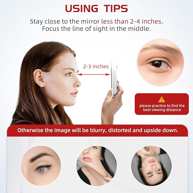 • 【Shopping Tips】If it’s your FIRST TIME to use a magnifying mirror, please be sure to read the following before purchase. 20x magnifying mirror is concave, you need to get VERY CLOSE to the mirror and focus on the MIDDLE AREA of it, otherwise, you will feel distorted or upside down. Not suitable for people who want to see the whole face when makeup. PLEASE BUY WITH CAUTION.