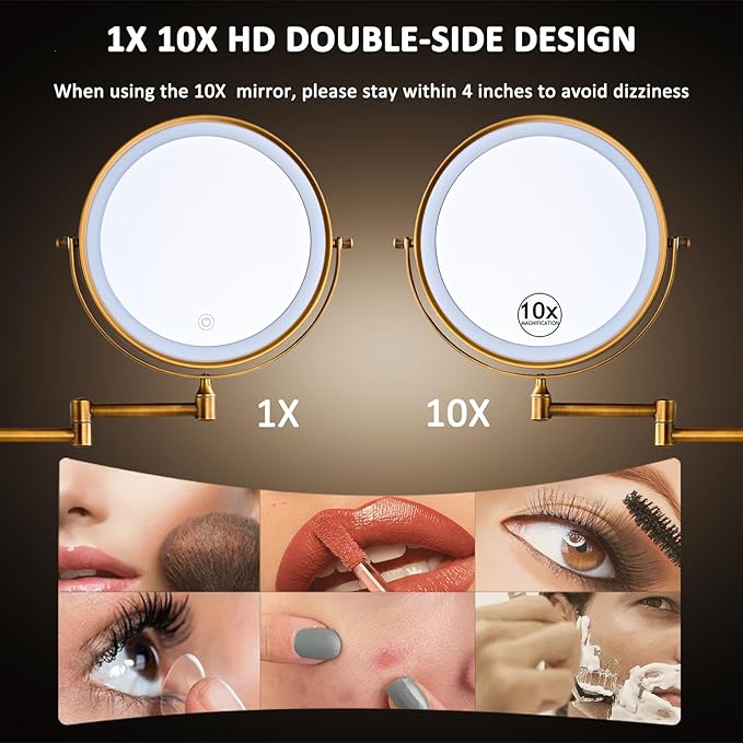 - 8 Inch Double Sided 1X/10X Magnifying Mirror: This dual sided magnifying mirror is upgraded 8 inch large size which provided a perfect wide-angle view. The lighted 10X magnification mirror shows details of your face when putting eyeliner, mascare, perfect for delicate makeup, you also can change 1X mirror for your overall facial makeup. Please keep 4 inch distance when use the 10X magnifying mirror to avoid dizzy and distortion