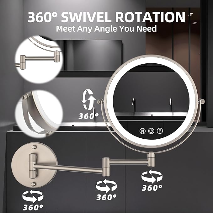 - 【1X/10X Double-Sided Magnifying Mirror】Getting all details of your faces with a 10X magnifying mirror, which is ideal for make-up, eyebrow tweezing, facial care, and hair styling. The wall mounted makeup mirror can be 360 swivel freely. Easy to find the perfect viewing angle of this vanity mirror with lights without effort.Note: You should be at least with a distance of 4 inches to mirror for a more detailed and less distorted image or dizzying.