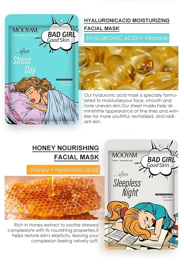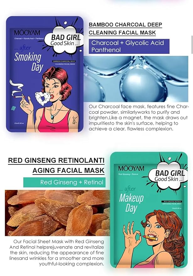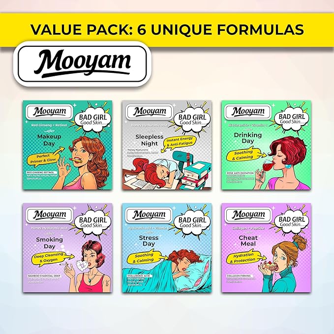 BAD GIRL Face Mask Set - 6 Pack Hydrating Sheet Masks for Self Care - Funny Pop Art Beauty Gifts for Women & Teens - Moisturizing, Brightening & Pore Refining - 6 Unique Skin Recovery Formulas