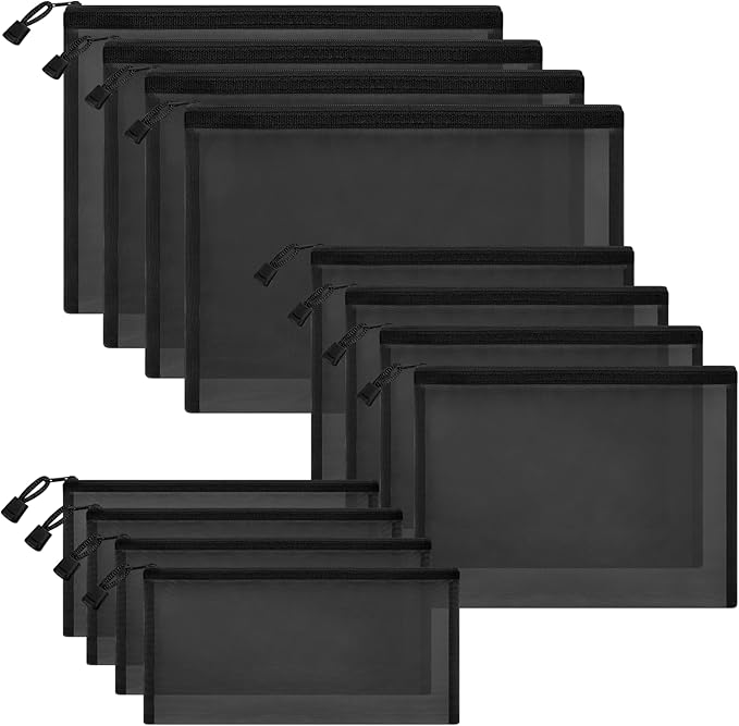 12 Pieces Zipper Nylon Mesh Pouch, Mesh Cosmetic Bags Makeup Bags Pencil Case, Multipurpose Travel Bags for Cosmetic School Office Supplies and Travel Accessories (Black, Assorted Sizes)