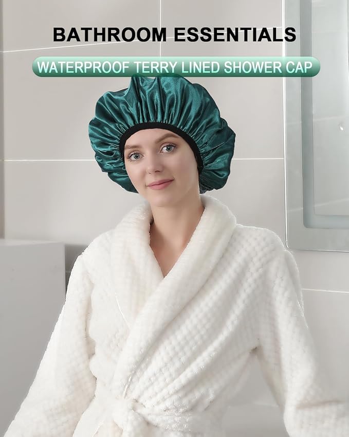 YIZIJIZI Triple Layer Reusable Waterproof Shower Cap for Women Large Terry Lined Hair Cap for Long Thick Hair Travel Bath Care Blackish Green