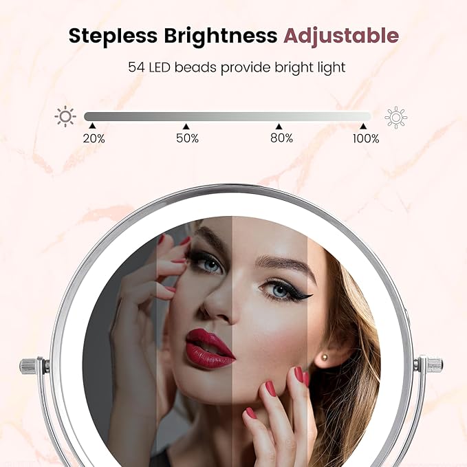 - 【10X Magnifying Mirror with High-Definition】 This double-sided lighted make up mirror features 1X & 10X magnification perfect, 1X meets the normal makeup needs, 10X is convenient for you to deal with the details of the makeup, also for face details like wearing contact lenses, trimming eyebrows, shaving, hair styling, facial treatments or applying mascara. Warm Tips: 10X MAGNIFICATION IS POWERFUL—KEEP 4" DISTANCE FOR OPTIMAL CLARITY