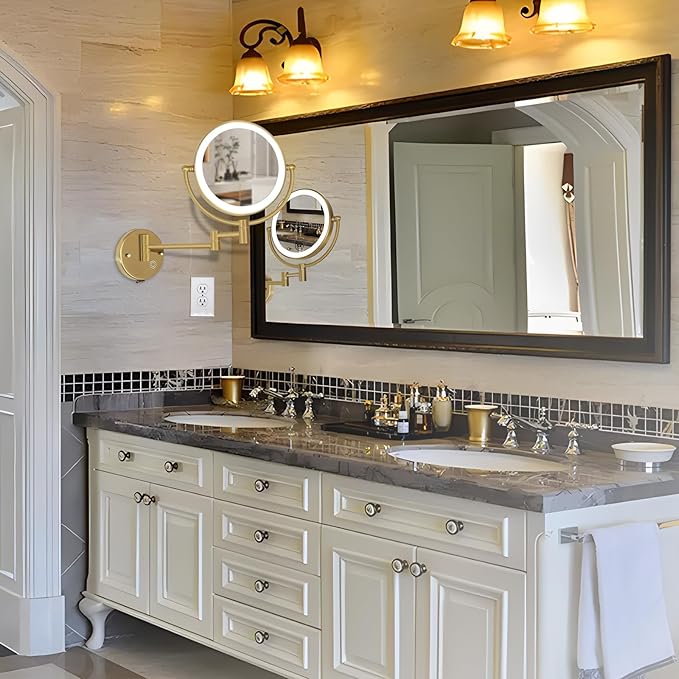 - Double-sided 5X Wall Magnifying Mirror Wall Mount for Bathroom: The material of the wall mount makeup mirror mainly is brass, which can adapt to the humid environment of the bathroom for a long time without corroding. Double-sided mirror reversible, lighted 1x mirror for overall makeup, skincare, and shaving. 5x magnifying mirror with lights for close-up details like plunking eye browns, cleaning up acne and wearing contact lenses