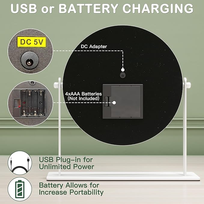- 【Flexible Power Options】 Say goodbye to charging concerns and tangled cords with our versatile makeup mirror with lights for makeup desk! This mirror can be powered by either a USB cable (included and NOT rechargeable) or 4 AAA batteries (batteries NOT included), providing convenient and flexible lighting options, making it perfect for traveling or on-the-go use.