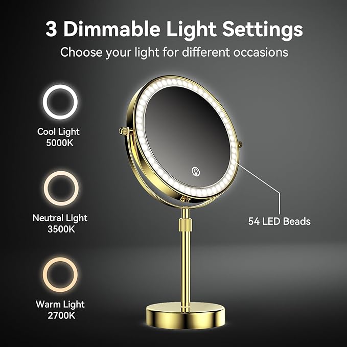 - 【Brightness Adjustable 3 Color Lighting】- This LED lighted makeup mirror has 3 light options including warm yellow, cool white and natural white light. Mimics lights of different scenes such as office, outdoors or party, which is practical and helpful to get a perfect makeup according to your needs. Operation--short press to change 3 color lights then to turn it off; long press to freely adjust light brightness from 0-100% or 100%-0. The memory function allows you to do make-up with your previous brightness setting when you turn on the light next time.