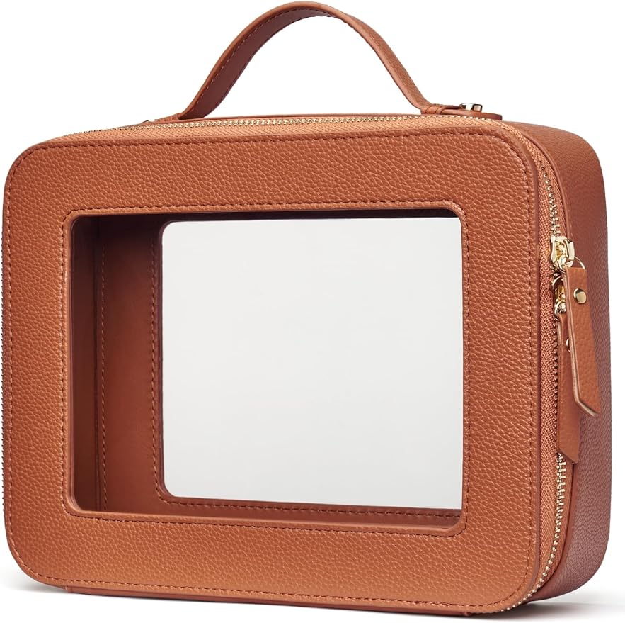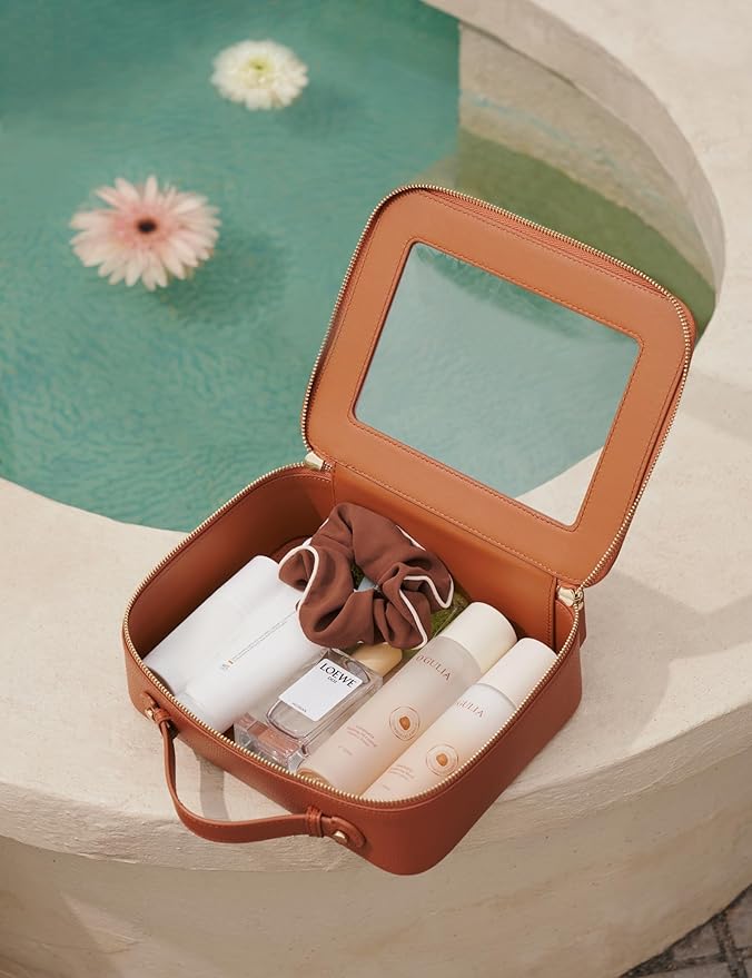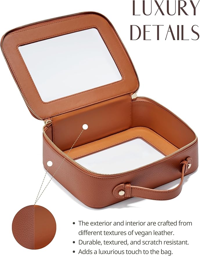 - [Spacious and Roomy] – The brown travel make up bag measures 9.6'' x 7.5'' x 3.1'' (24.5cm x 19cm x 8cm), ideal for extended trips or situations where you need to carry a comprehensive collection of makeup and skincare products. It is designed to fit comfortably in suitcases and big travel bags.