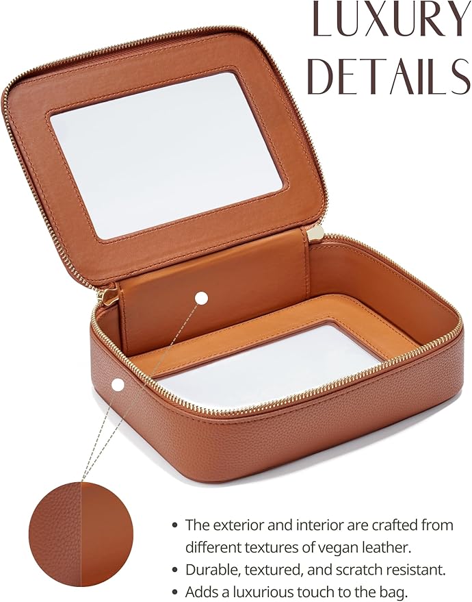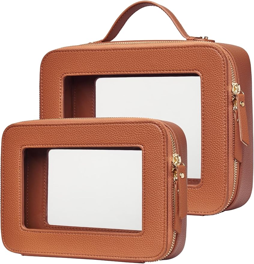 - [Premium Material and Durability] β The clear small cosmetic case, both the exterior and interior, is crafted from high-grade faux leather of different textures, which is highly scratch resistant, durable and exceptionally easy to keep clean. It features a smooth zipper for secure closure, and elegant light gold metal hardware accents, adding a luxurious and sophisticated touch to the bag's overall design.