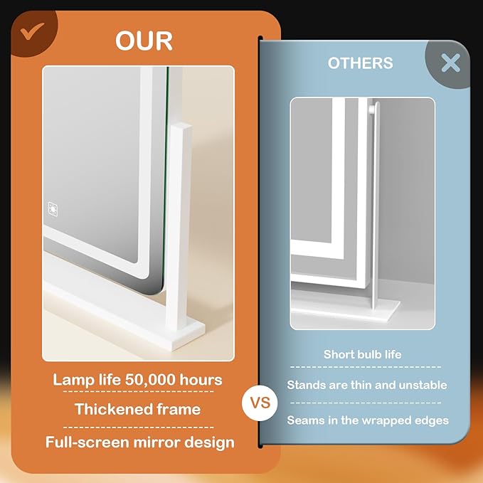 - Upgrade brightness: Most of the makeup mirrors with light bars on the market only have 80 light beads, which makes consumers feel that the lighting is not enough. We have improved on this! We have a full 120 light beads light bar per meter,which greatly improving the brightness of the makeup mirror.