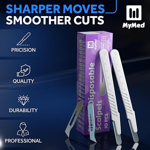 - A GOOD VALUE PACK - MyMed sterilized scalpel dermaplane blades 10r with plastic scalpel handle, that helps you learn to dermaplane by yourself, With round edge dermaplane razor Achieve flawless facial hair removal with our dermaplane razor for women face. disposable surgical scalpel knife. Use it for small aesthetic procedures: scalpel for callus, 10r dermaplane blades, podiatry 10r scalpel, Taxidermy supplies, cyst removal blade, blackheads, acne scalpel, face dermaplaning tool, & more