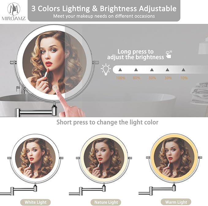 - ใ๐๐ญ๐๐ฉ๐ฅ๐๐ฌ๐ฌ ๐๐ข๐ฆ๐ฆ๐ข๐ง๐ & ๐ ๐๐จ๐ฅ๐จ๐ซ ๐๐ข๐ ๐ก๐ญ๐ข๐ง๐ ใ - This dual sided wall mirror offers white lights, warm lights and cool lights. White light for daily office or normal makeup, warm light for party or club makeup , natural light for date or outdoor makeup. Easy to change the light mode by single touch the button and long press to adjust the brightness to meet your need, double tap to turn off. Lights will shut off automatically after 30 minutes of inactivity