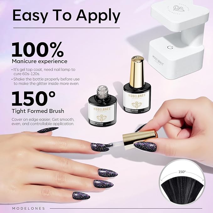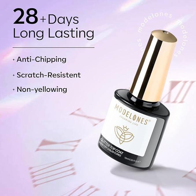 - Playful Glitter Top Coat: Modelones 2024 upgrade translucent top coat gel with sprinkled sequins glitter; Adds a vibrant mix of confetti-like glitter to your nails to achieve a festive and fun look, perfect for celebrations or adding a pop of color