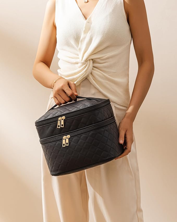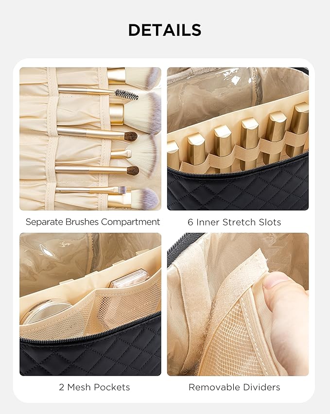 - PERFECT DESIGN - Meticulously crafted with a dual-layer design, the main compartment features a top and bottom layout, along with 2 small pockets and 6 internal elasticized pockets. Enjoy dedicated spaces for your makeup brushes, lipsticks, mirrors, and essential makeup tools, ensuring a well-organized and easily accessible beauty experience.