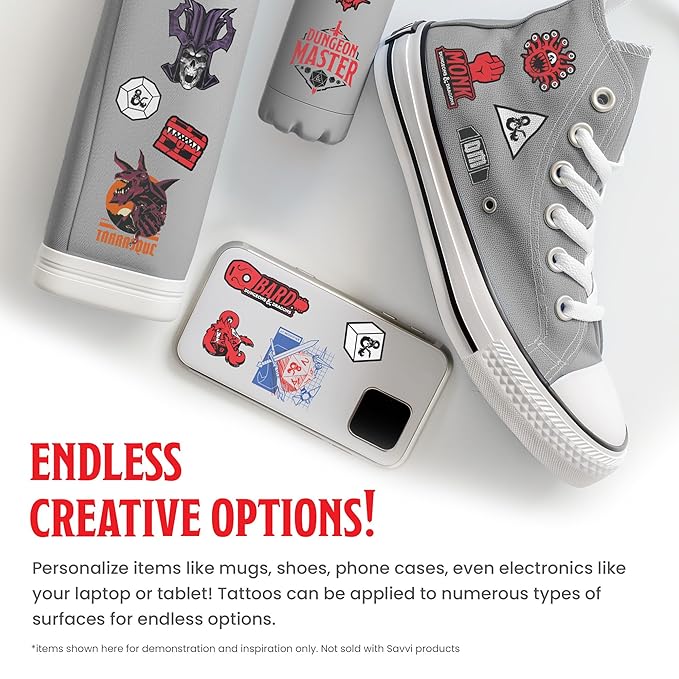 - CHOOSE YOUR QUEST: In the realm of Dungeons and Dragons, Savvi's Temporary Tattoo Pouches unite with the magic of the game to kindle the inner adventurer in both kids and adults. The set includes 50 designs.