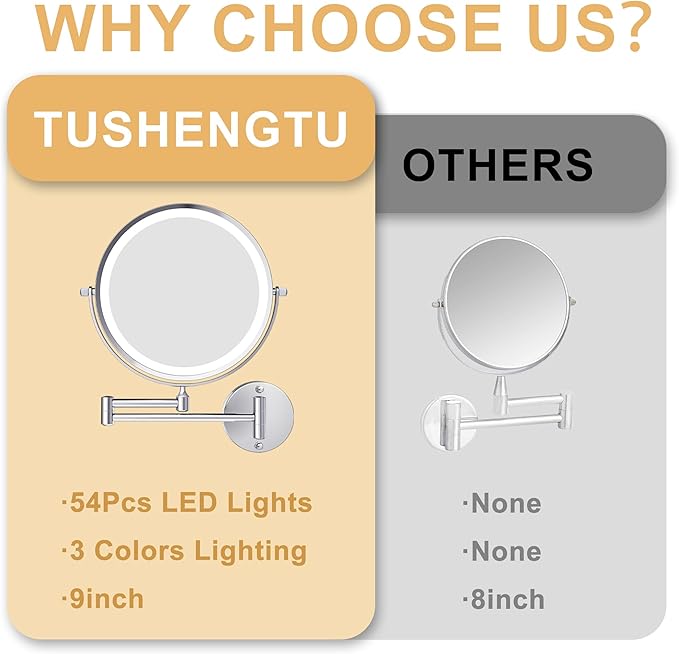 - 【24 Months After-Sales Service】 ✔️Package✔️ Chrome Wall Mount Magnifying Mirror *1, USB Cable *1. Lighted makeup magnifying mirror wall mounted is very simple to install, please check that all accessories are complete before installation.TUSHENGTU has strict quality inspection. We provide 24 months after-sales service. Please contact customer service for any problems in use.Wall Mounted Vanity Mirror with light