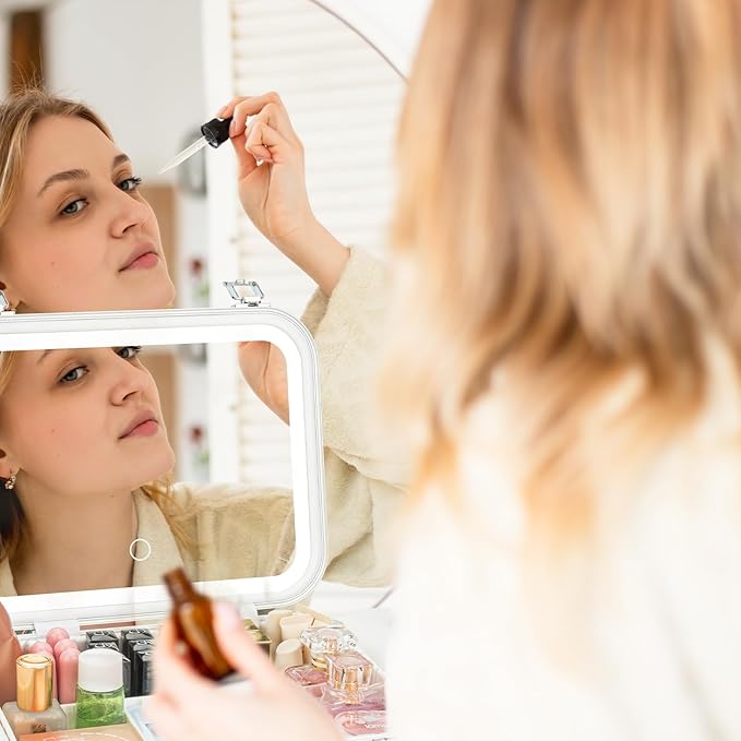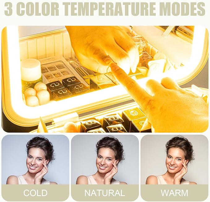 - 【UBS Rechargeable】The travel makeup case has a built-in 5000 mAh lithium polymer battery, USB-C port for fast charging, made of German Bayer PC material and ultra-hard aluminum alloy frame, it's a hard-shell makeup case, the touch screen button on the bottom of the mirror will emit a red light when charging, and the battery will turn to green when it's full.