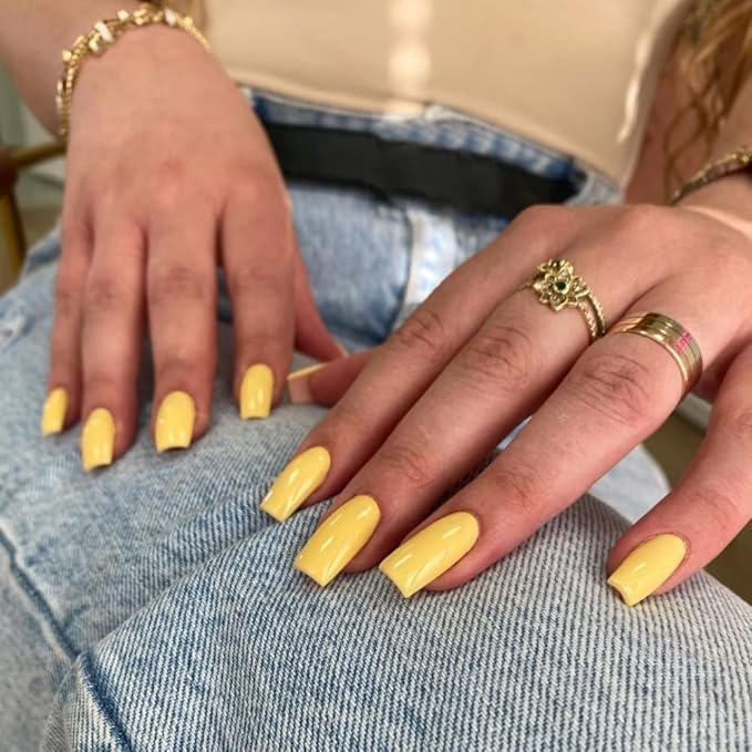 Yellow Press on Nails Long Square, KXAMELIE Medium Coffin Nails Press ons Long Glue on Nails Natural Thick Fake Long Nails Acrylic Nails Reusable 24 Fake Nails Solid Color False Nails for Women