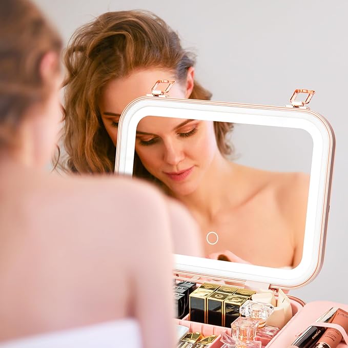 Travel Makeup Train Case With LED Lights, 3 Brightness Adjustable Portable Makeup Organizer, Professional Adjustable Divider Storage Waterproof Makeup Train Case Accessories and Toolboxes