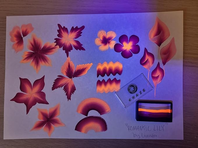 - VIBRANT BLACKLIGHT REACTIVE POPPING NEON COLORS: Kraze FX Wish Domed Split Cake features: Neon Blue, Neon Yellow, Neon Orange, Neon Pink. Kraze FX Neon Cake is high quality, black light reactive color that works great for amazing effect under blacklight or neon light. The wax based split cakes are perfect for all aspects of face and body painting such as colorful blending and shadowing effects. The extremely durable formula offers a smooth, solid coverage.