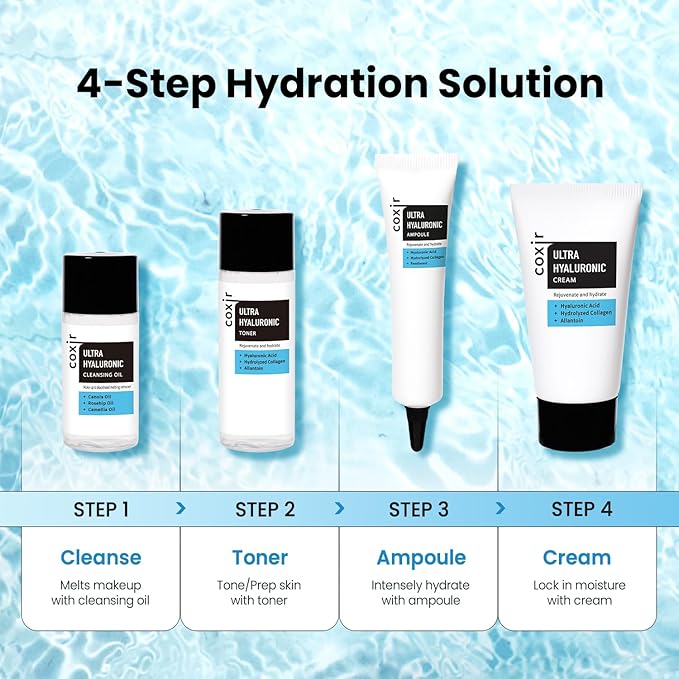 [New Years Gift] coxir Ultra Hyaluronic Holiday Gift Set – Cleansing Oil + Toner + Ampoule + Cream |Mini Skincare Kit, Travel-Size Korean Skincare Set, Hydrating Routine | Christmas Mini Gift