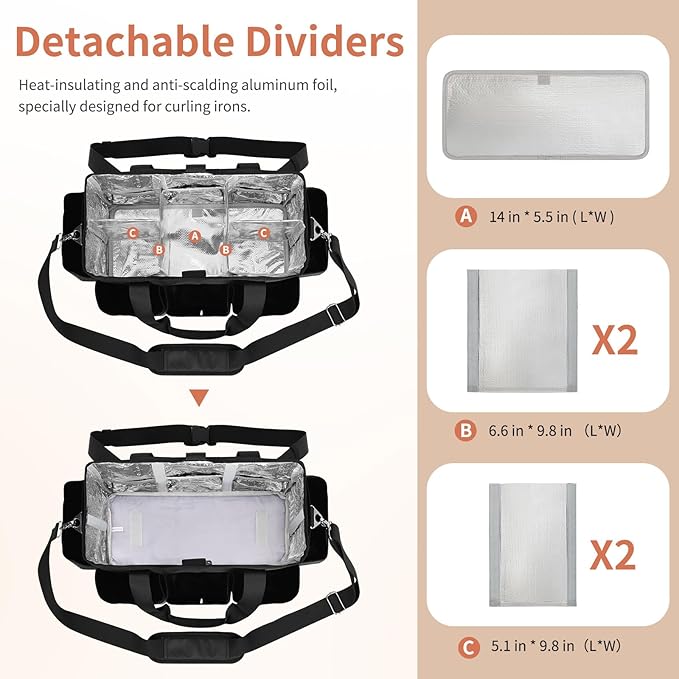 - 〖Detachable Dividers〗: The hair tools travel bag comes with 4 detachable dividers and 1 thickened bottom plate, which divide the bag into 5 large spaces, and also can be adjusted as needed, making it convenient for you to organize and store large items. The detachable bottom plate can be used as a separate heat insulation pad.