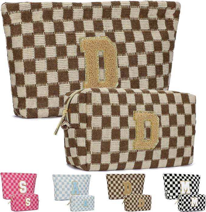 2PCS Checkered Makeup Bag for Women Personalized Initial Letter Makeup Bag Travel Toiletry Bag Organizer Cute Makeup Brushes Storage Bag Mother's Day Birthday Gift for Women (Brown D)