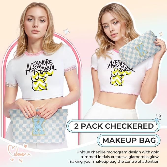 2PCS Checkered Makeup Bag for Women Personalized Initial Letter Makeup Bag Travel Toiletry Bag Organizer Cute Makeup Brushes Storage Bag Mother's Day Birthday Gift for Women (Blue D)