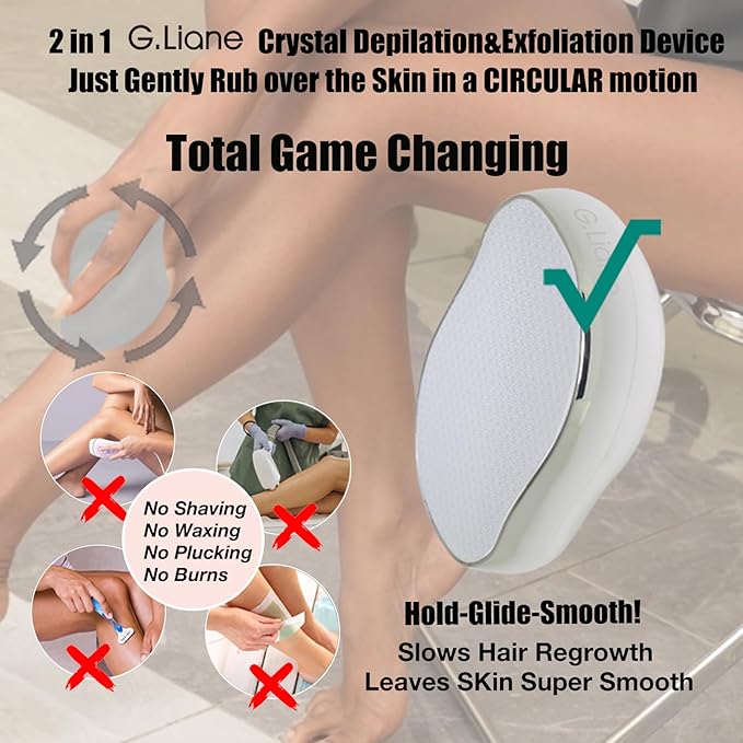 - Skin Friendly and Travel Friendly:G.Liane magic physical crystal epilator is made by advanced nano crystallized techniques,no sharp blades,no irritation,totally skin friendly for all skin types and multi body parts.But not suggested on face,armpits and sensitive skin.Small handy size and No battery-powered makes hair removal portable and convenient.You can enjoy silky smooth anywhere anytime.