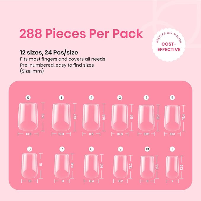 - 【Fit Nails Perfectly】:This 288 PCS false nail tips set comes in 12 sizes for effortless matching to each finger. Each nail tip in the transparent series features a thinner edge to fit your natural nails. Beetles nail tips offer a more natural appearance, resembling nails that have grown out naturally.