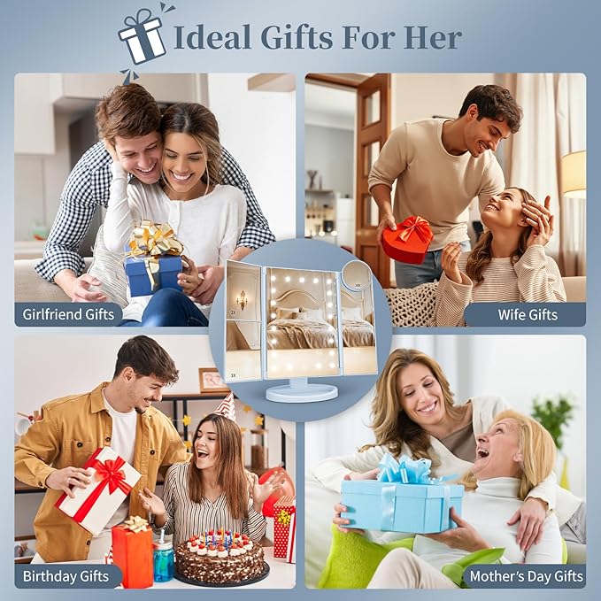 HUONUL Makeup Mirror, Vanity Mirror with Lights, 2X/3X/10X Magnification, Touch Control, Trifold Mirror, Dual Power Supply, Valentines Day Gifts for Her,Gifts for Women, Wife, Mom, Teengirls