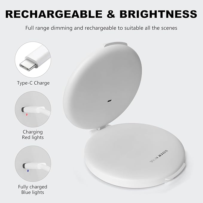 - 【Adjustable Bracket】This Travel Mirror With Light Features A Stable Hinge That Allows For 300-Degree Adjustable Rotation, Enabling It To Lay Flat On The Desktop Or Fold And Flip For Finding Any Angle You Need.
