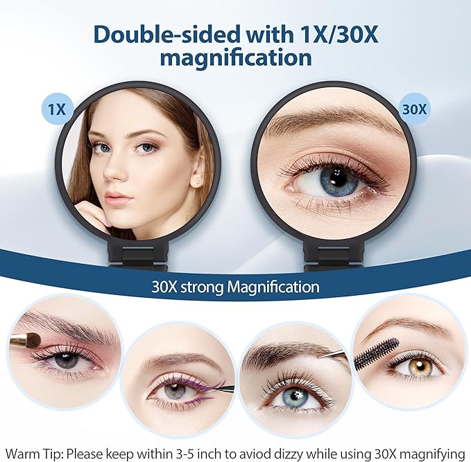 - Best Selling Items for the Elderly: Dual-sided design with an ergonomically crafted handle featuring a matte coating for enhanced grip and a lightweight feel. The 30x magnifying side ensures precision for detailed tasks like eyebrow grooming, false lash application, and blackhead removal, while the 1x standard mirror meets everyday makeup needs. Includes precision tweezers for delicate operations. Ideal for makeup enthusiasts, skincare lovers, individuals with visual impairments, and those aged 30 and above.