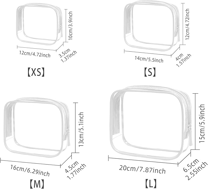 - 【Universal Multi Size 】The beach bag essentials kit had four sizes. The largest being used to carry larger items such as diaper, bath towels, wet swimsuit, etc. It's great for organizing your daily essentials and travel. Can hold travel-sized bottles, travel pouches, makeup, toiletries, and more for camping, or gym use. Package includes:1 PACK large: 7.84 x 5.9 x 2.55 inches; 1 PACK Middle: 6.29 x 5.1 x 1.77 inches; 1 PACK Small: 5.5 x 4.72 x 1.57inches; 1 PACK XS:4.72 x 3.9 x 1.37inches
