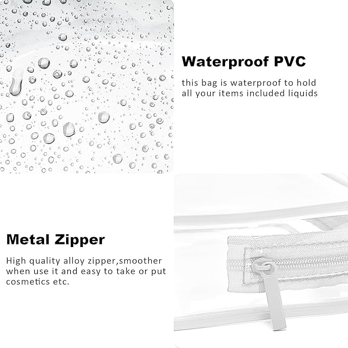 - 【Durable Waterproof Material】The clear cosmetic case is sturdy and spacious which are made of durable, reusable PVC plastic and sturdy smooth zipper. The waterproof material prevent liquids from leaking out, wide opening allows for quick drying and also the bags is easy to clean and maintain, only need wiped clean with a damp cloth