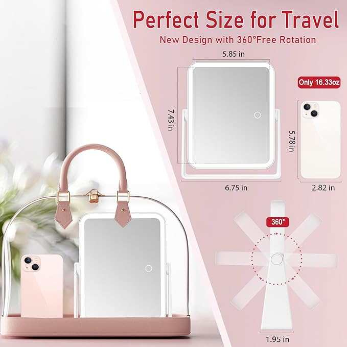 - 7.5'' Rectangular Sturdy and Stable Design: This makeup mirror with lights and magnification is 8.29" H x 6.75" L x 1.95" W size, providing a high-definition wide-angle view. The compact design takes up very little space and the non-slip pad on the bottom allows the mirror to stand stably on the countertop, preventing the make up mirror with lighting from slipping or falling during use. The white exterior and base can be placed in harmony with any scene. It is not only a professional vanity lighted magnifying mirror that can be used in home, bathroom, hotel, spa, beauty salon, etc., but also a desk lamp, night light, atmosphere light and more