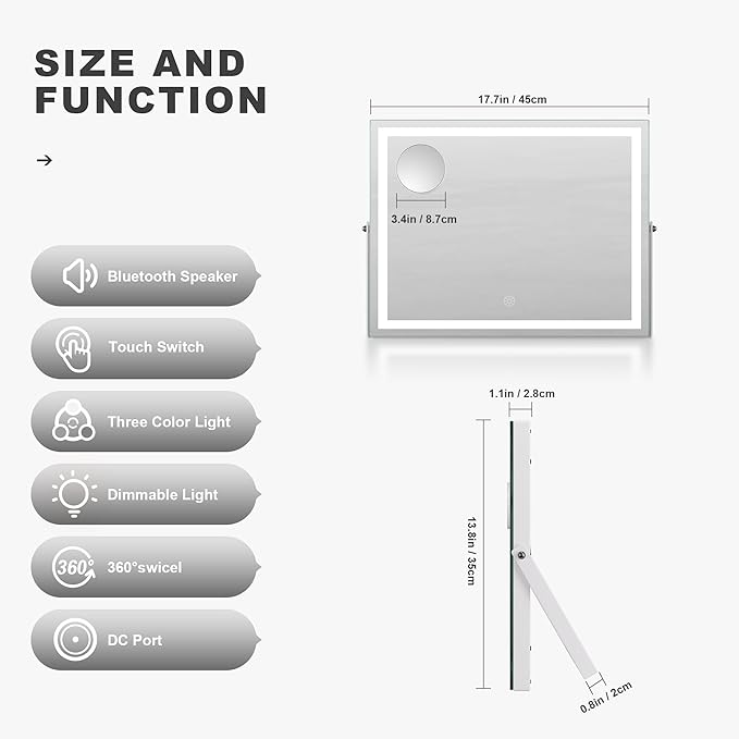 Hasipu Vanity Mirror with Lights and Bluetooth Speaker, 17.7" x 13.8" LED Makeup Mirror with 10X Magnification, Smart Touch 3 Colors Dimmable, Brightness Adjustment, 360ยฐ Rotation, White