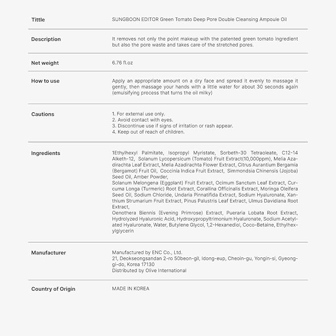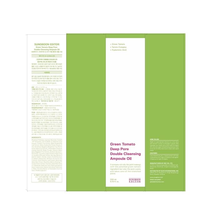 SUNGBOON EDITOR Green Tomato Double Cleansing Ampoule Oil | Makeup remover, Blackhead Removal | Exfoliating Face Wash for Women | Pore Minimizer for Face | Korean Skin Care | 6.76 oz. (200g)