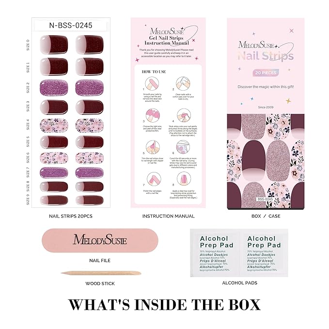 - Exclusive Design: MelodySusie's gel nail strips designs for any occasion (shopping, dating, friends gathering, wedding, gifts, Christmas or simply at home). Nail strips ranging from solid colors and french tips to glitter and patterned designs, MelodySusie has the perfect semi cured gel nails style for every occasion.