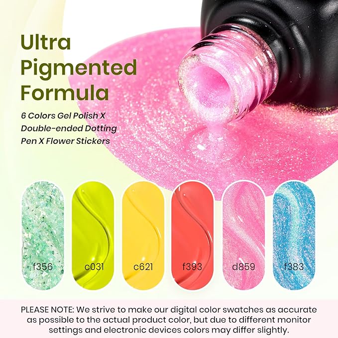 - 6 Trendy Spring Colors – This gel nail polish set includes a stunning mix of green, yellow, blue, pink, and glitter shades, perfect for creating fresh and playful nail art for any occasion.