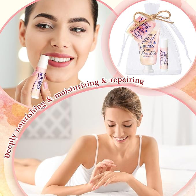 - Elegant Design: each hand cream and lip balm has flower patterns and Bible text design, which is exquisite and elegant, improves the atmosphere of gift giving, and can bring you a positive mood; This is a cute and attractive gift, an ideal thank you gift for women, and an ideal choice for Mother's Day, wedding, Valentine's Day, and Christmas gifts
