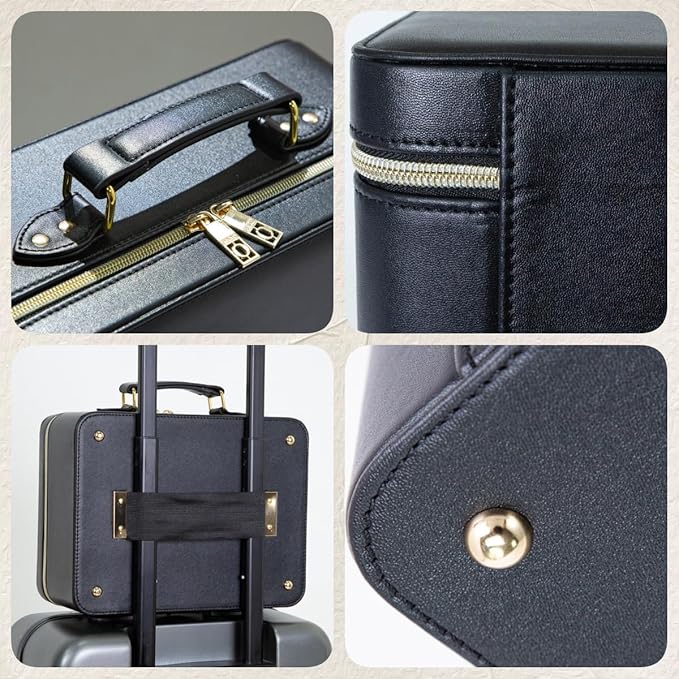 - 【Sturdy Makeup Bag】Designed with the high-quality ABS and PU leather material. This makeup bag has a sturdy load-bearing and anti-pressure ability which can perfectly protect the cosmetics inside the bag. It also waterproof and easy to clean. Ergonomic handle, electroplated light gold snap is anti-corrosion, not easy to fade. And there is a double-layer shockproof design inside the mirror to protect it from easy damage.