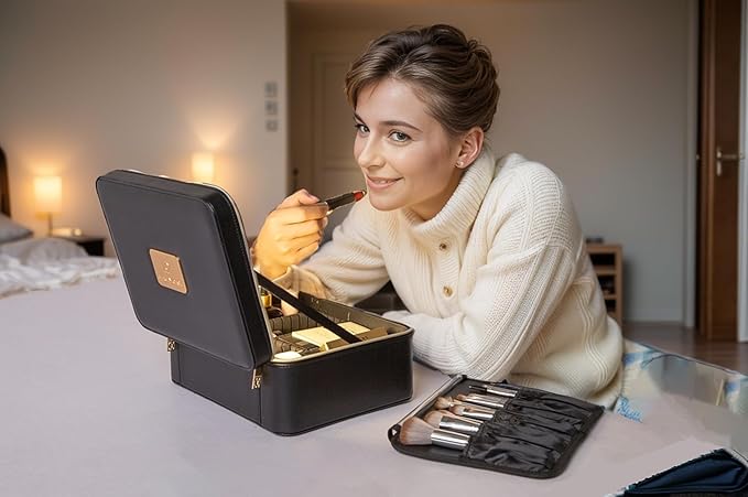 - 【Large Storage Capacity】This makeup bag with led light up mirror has a large capacity. The intelligently designed partition storage system ensures that all your various kinds of cosmetics can find a designated and sorted spot. This makeup train case is thoughtfully crafted to cater to different sizes of cosmetics and equipped with leather stoppers on both sides, preventing cosmetics from coming in contact with the mirror and holding makeup brushes in place.